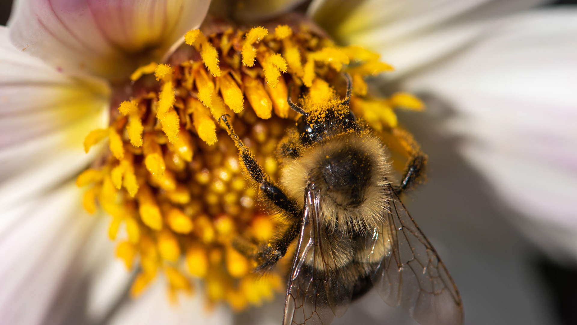Note the reflection in the bee's eye. The purple flowers below, the blue sky above, and me the photographer in the middle.